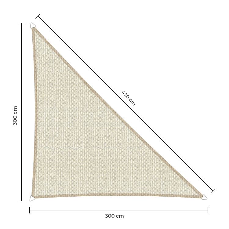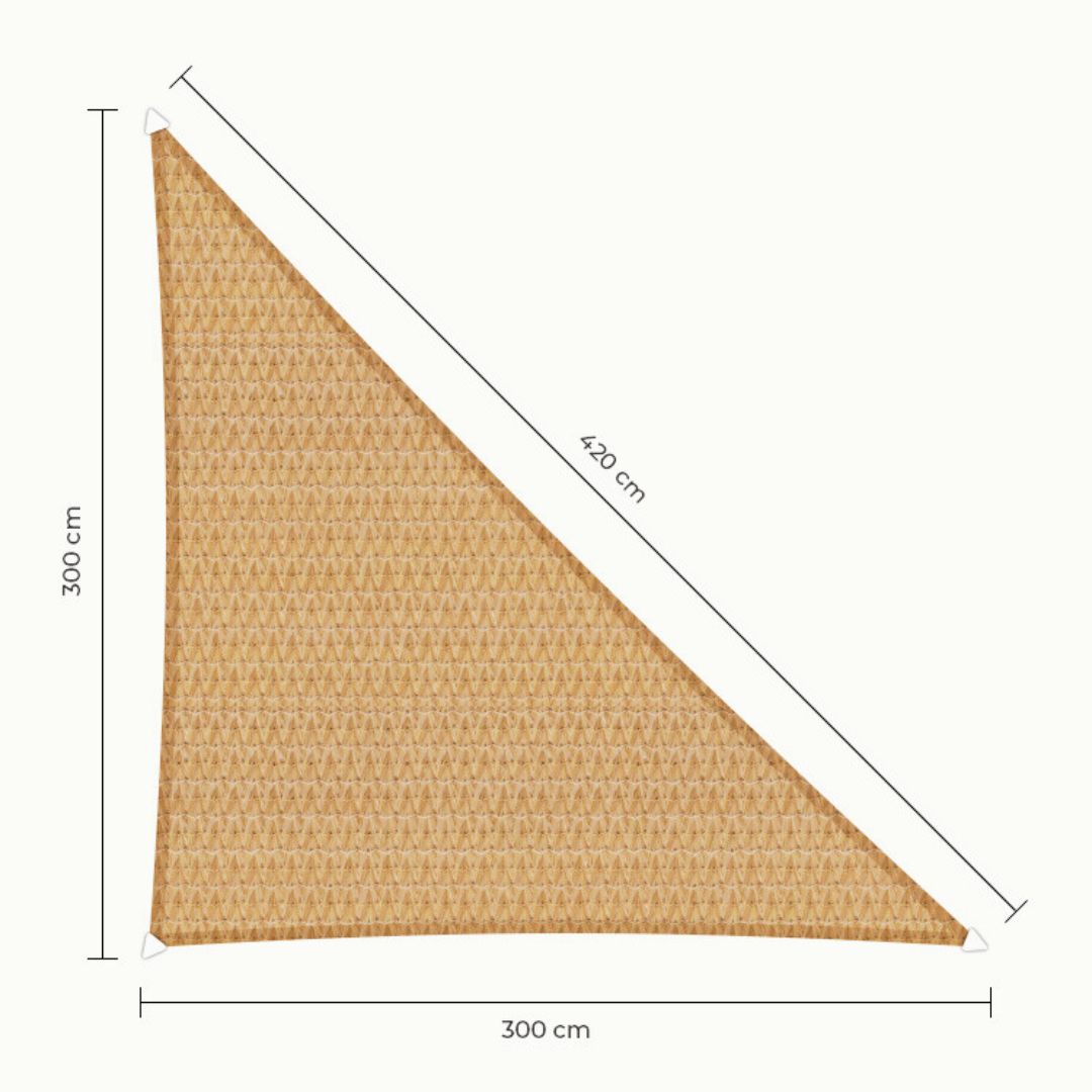Dit driehoekige schaduwdoek van 300 × 300 × 420 cm is ideaal om een compacte, maar effectieve schaduwplek te creëren in je tuin, op het terras of op een recreatieplek. Het doek is gemaakt van HDPE, waardoor het waterdoorlatend, UV-bestendig en duurzaam is voor langdurig gebruik.